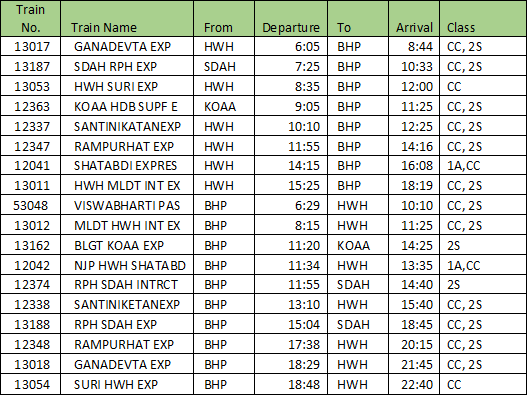 You can take the following trains from Howrah and reach Bolpur Santiniketan station. You have to hire private taxi, rickshaw to reach Santiniketan.